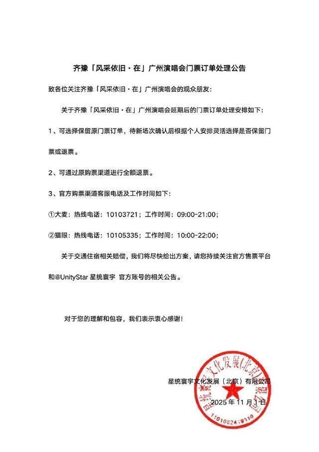 随后,星统寰宇发布演唱会门票订单处理公告: 1、可选择保留原门票订单,待新场次确认后根据个人安排灵活选择是否保留门票或退票。 2、可通过原购票渠道进行全额退票。 关于交通住宿相关赔偿,我们将尽快给出方案,请您持续关注官方售票平台和@UnityStar星统寰宇官方账号的相关公告。